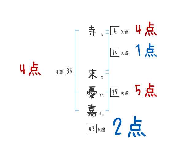 外運![]() | 寺来憂嘉さんの外運は35画の4つ星!温厚な性格で感受性が高い。穏和な性格で人望が厚い。 生活面を象徴する運勢です。外部から受ける影響力を表し、結婚運、家庭運や職場、環境への順応性を表します。 |