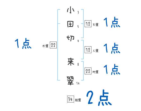 総運![]() | 小田切来翠さんの総運は34画の2つ星!独創性に優れるが、自尊心が強く災難に注意しましょう。 あなたの人生を表す1番重要な運勢です。生涯を通じて影響する総合運となり、主に50歳以降の晩年期に影響を及ぼします。 |