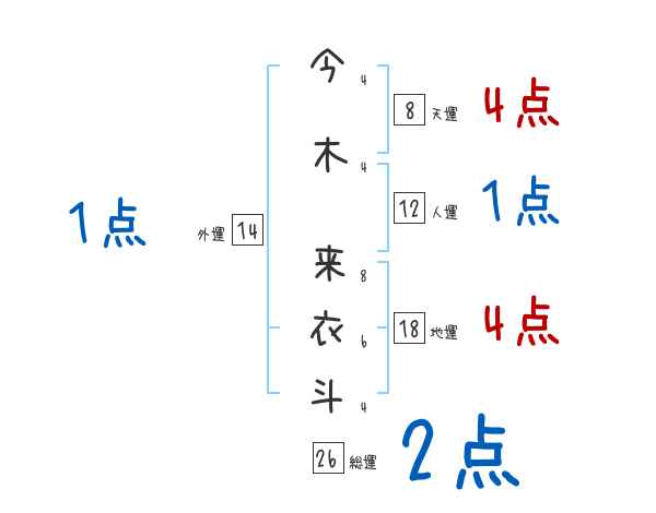 外運![]() | 今木来衣斗さんの外運は14画の1つ星!人に対して優しいがストレスを溜め込みがち。人間関係のトラブルを避けるよう気をつけましょう。 生活面を象徴する運勢です。外部から受ける影響力を表し、結婚運、家庭運や職場、環境への順応性を表します。 |