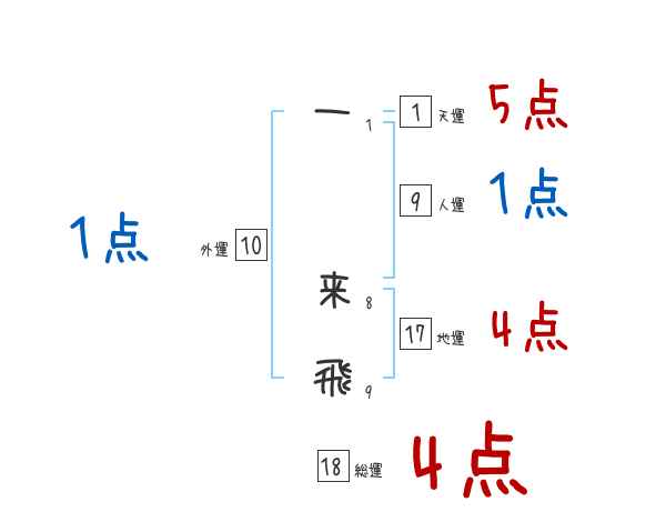 天運![]() | 一来飛さんの天運は1画の5つ星!行動力、指導力があり出世し繁栄する。幸運に恵まれる。 家系が持つ宿命的な運勢を表します。祖先から受け継いだ苗字ですので自分の力が及びません。家柄を象徴します。 |