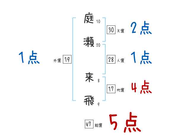 天運![]() | 庭瀬来飛さんの天運は30画の2つ星!浮き沈みの激しさに注意しましょう。 家系が持つ宿命的な運勢を表します。祖先から受け継いだ苗字ですので自分の力が及びません。家柄を象徴します。 |