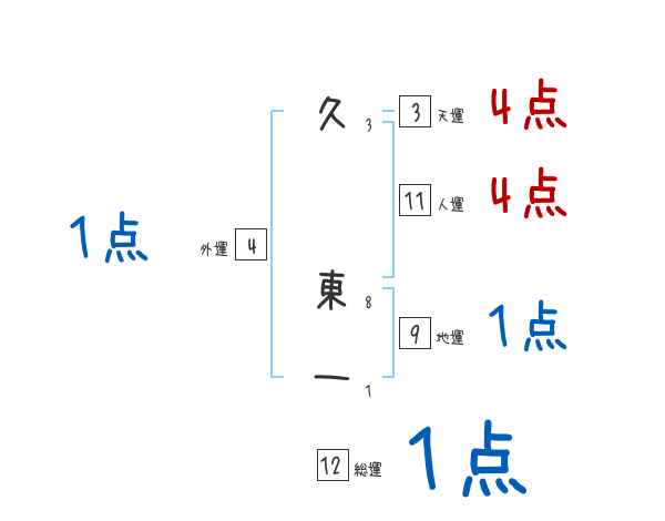 天運![]() | 久東一さんの天運は3画の4つ星!活動的で才能に恵まれ、多くの信頼を得る。希望に満ち成長する。 家系が持つ宿命的な運勢を表します。祖先から受け継いだ苗字ですので自分の力が及びません。家柄を象徴します。 |