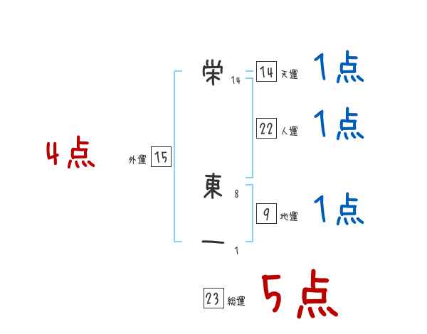 総運![]() | 栄東一さんの総運は23画の5つ星!想像力に優れ活力がある。一代で成功し名誉を手に入れる。 あなたの人生を表す1番重要な運勢です。生涯を通じて影響する総合運となり、主に50歳以降の晩年期に影響を及ぼします。 |