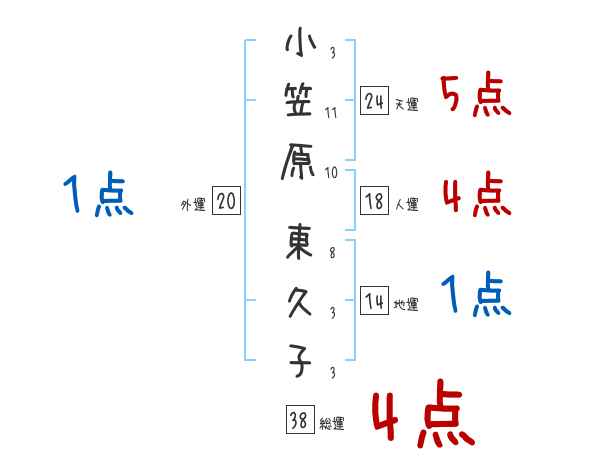 天運![]() | 小笠原東久子さんの天運は24画の5つ星!家庭運が良く順調な人生。金運にも恵まれる。 家系が持つ宿命的な運勢を表します。祖先から受け継いだ苗字ですので自分の力が及びません。家柄を象徴します。 |