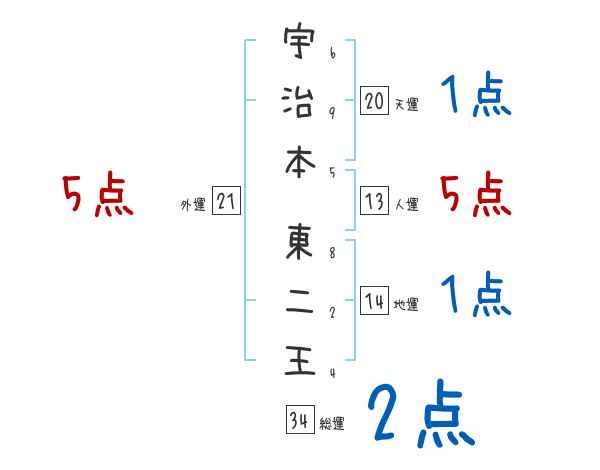 人運![]() | 宇治本東二王さんの人運は13画の5つ星!才能に恵まれ人気がある。名声を手に入れる。円満な人生。 性格や才能などを表す2番目に重要な運勢です。人間関係や協調性、社会的な成功に影響します。主に20歳から50歳ぐらいまでの中年期の運勢を表します。 |