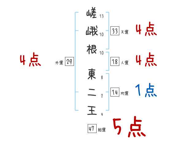 天運![]() | 嵯峨根東二王さんの天運は33画の4つ星!権力志向でプライドが高い。勇気があり運を切り開き成功する。 家系が持つ宿命的な運勢を表します。祖先から受け継いだ苗字ですので自分の力が及びません。家柄を象徴します。 |