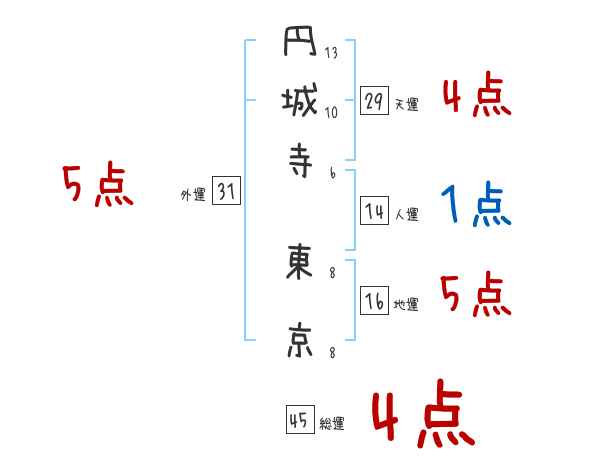外運![]() | 円城寺東京さんの外運は31画の5つ星!社交性があり判断力に優れる。順風満帆な人生で円満な生活。 生活面を象徴する運勢です。外部から受ける影響力を表し、結婚運、家庭運や職場、環境への順応性を表します。 |
