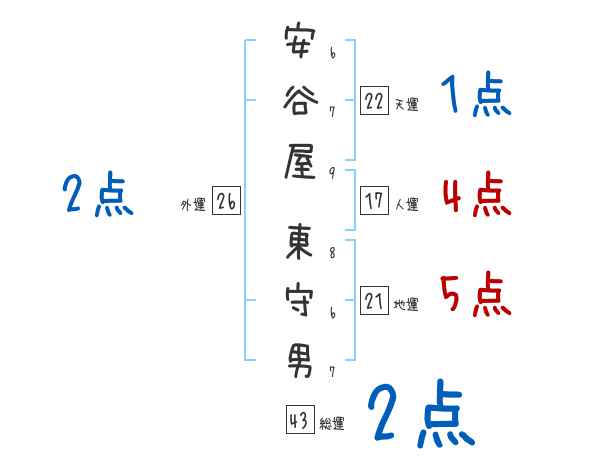 安谷屋東守男さんの画数の鑑定結果