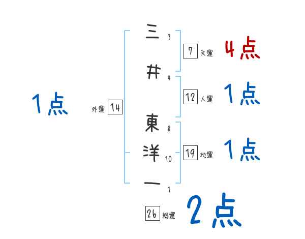 天運![]() | 三井東洋一さんの天運は7画の4つ星!強い意志や信念を持ち独立心が強い。自立する。 家系が持つ宿命的な運勢を表します。祖先から受け継いだ苗字ですので自分の力が及びません。家柄を象徴します。 |