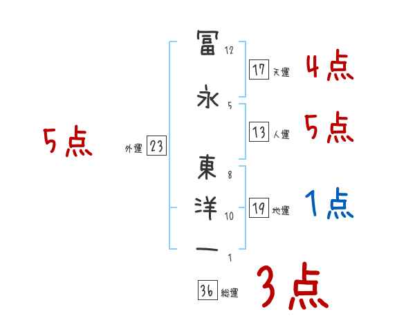 外運![]() | 冨永東洋一さんの外運は23画の5つ星!想像力に優れ活力がある。一代で成功し名誉を手に入れる。 生活面を象徴する運勢です。外部から受ける影響力を表し、結婚運、家庭運や職場、環境への順応性を表します。 |