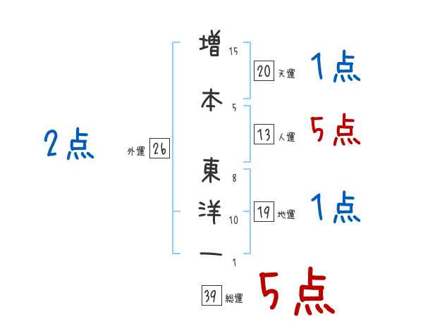 総運![]() | 増本東洋一さんの総運は39画の5つ星!社交性に優れ人望が厚い。人の上に立ち成功する。 あなたの人生を表す1番重要な運勢です。生涯を通じて影響する総合運となり、主に50歳以降の晩年期に影響を及ぼします。 |