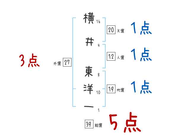 総運![]() | 横井東洋一さんの総運は39画の5つ星!社交性に優れ人望が厚い。人の上に立ち成功する。 あなたの人生を表す1番重要な運勢です。生涯を通じて影響する総合運となり、主に50歳以降の晩年期に影響を及ぼします。 |