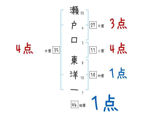 外運![]() | 瀬戸口東洋一さんの外運は35画の4つ星!温厚な性格で感受性が高い。穏和な性格で人望が厚い。 生活面を象徴する運勢です。外部から受ける影響力を表し、結婚運、家庭運や職場、環境への順応性を表します。 |