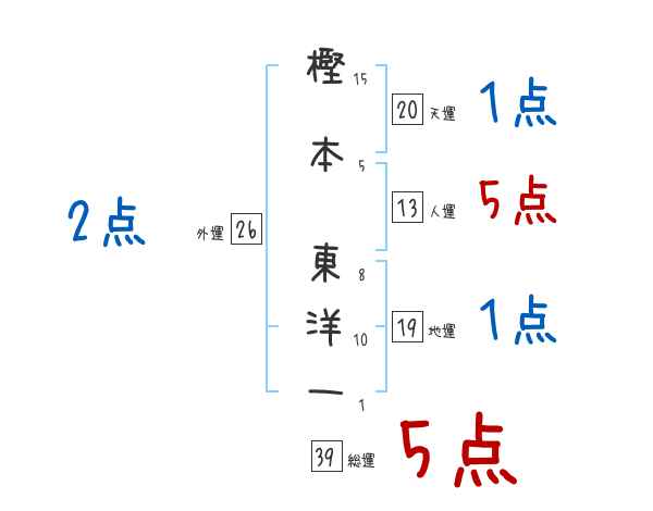 人運![]() | 樫本東洋一さんの人運は13画の5つ星!才能に恵まれ人気がある。名声を手に入れる。円満な人生。 性格や才能などを表す2番目に重要な運勢です。人間関係や協調性、社会的な成功に影響します。主に20歳から50歳ぐらいまでの中年期の運勢を表します。 |