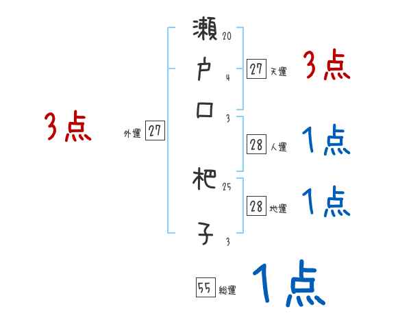 天運![]() | 瀬戸口杷子さんの天運は27画の3つ星!頭脳明晰だが強情で摩擦が多い傾向。孤立に注意。 家系が持つ宿命的な運勢を表します。祖先から受け継いだ苗字ですので自分の力が及びません。家柄を象徴します。 |