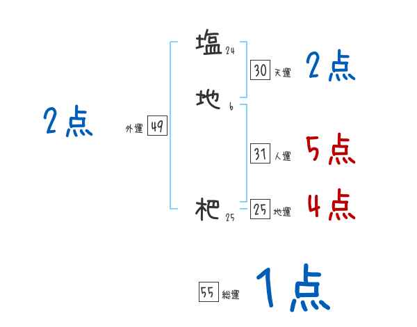 天運![]() | 塩地杷さんの天運は30画の2つ星!浮き沈みの激しさに注意しましょう。 家系が持つ宿命的な運勢を表します。祖先から受け継いだ苗字ですので自分の力が及びません。家柄を象徴します。 |