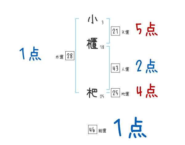 総運![]() | 小櫃杷さんの総運は46画の1つ星!迷走することが多く苦労するかも。目先のことにとらわれないように。 あなたの人生を表す1番重要な運勢です。生涯を通じて影響する総合運となり、主に50歳以降の晩年期に影響を及ぼします。 |