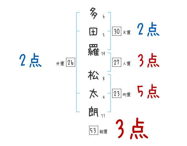 外運![]() | 多田羅松太朗さんの外運は26画の2つ星!波瀾万丈かも。信頼できる人を大事にしましょう。 生活面を象徴する運勢です。外部から受ける影響力を表し、結婚運、家庭運や職場、環境への順応性を表します。 |