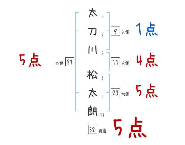 総運![]() | 太刀川松太朗さんの総運は32画の5つ星!柔軟性があり成功する。チャンスが多く金運が良い。 あなたの人生を表す1番重要な運勢です。生涯を通じて影響する総合運となり、主に50歳以降の晩年期に影響を及ぼします。 |