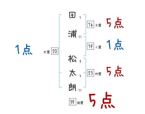 総運![]() | 田浦松太朗さんの総運は39画の5つ星!社交性に優れ人望が厚い。人の上に立ち成功する。 あなたの人生を表す1番重要な運勢です。生涯を通じて影響する総合運となり、主に50歳以降の晩年期に影響を及ぼします。 |