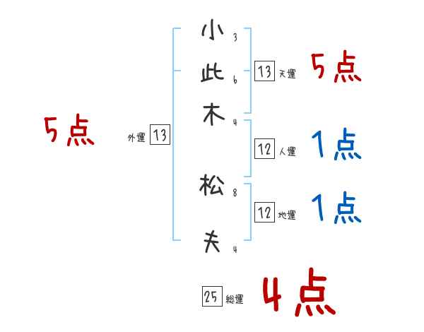 天運![]() | 小此木松夫さんの天運は13画の5つ星!才能に恵まれ人気がある。名声を手に入れる。円満な人生。 家系が持つ宿命的な運勢を表します。祖先から受け継いだ苗字ですので自分の力が及びません。家柄を象徴します。 |