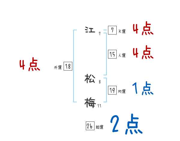 天運![]() | 江松梅さんの天運は7画の4つ星!強い意志や信念を持ち独立心が強い。自立する。 家系が持つ宿命的な運勢を表します。祖先から受け継いだ苗字ですので自分の力が及びません。家柄を象徴します。 |