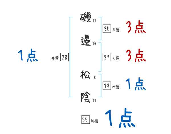天運![]() | 磯邊松陰さんの天運は36画の3つ星!先見性が豊かです。多少神経質で苦労することも。 家系が持つ宿命的な運勢を表します。祖先から受け継いだ苗字ですので自分の力が及びません。家柄を象徴します。 |