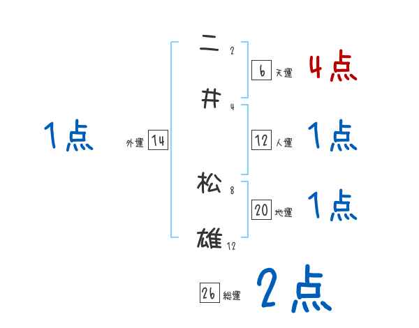 天運![]() | 二井松雄さんの天運は6画の4つ星!慎重な努力家で信頼を得る。誠実な精神で向上心に優れる。 家系が持つ宿命的な運勢を表します。祖先から受け継いだ苗字ですので自分の力が及びません。家柄を象徴します。 |