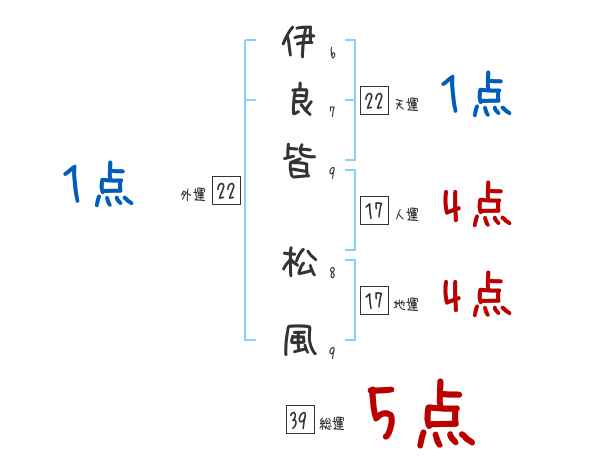 総運![]() | 伊良皆松風さんの総運は39画の5つ星!社交性に優れ人望が厚い。人の上に立ち成功する。 あなたの人生を表す1番重要な運勢です。生涯を通じて影響する総合運となり、主に50歳以降の晩年期に影響を及ぼします。 |