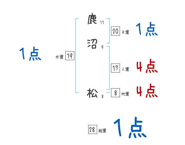 総運![]() | 鹿沼松さんの総運は28画の1つ星!家庭環境に注意。スポーツで活躍できる能力があるかも。 あなたの人生を表す1番重要な運勢です。生涯を通じて影響する総合運となり、主に50歳以降の晩年期に影響を及ぼします。 |