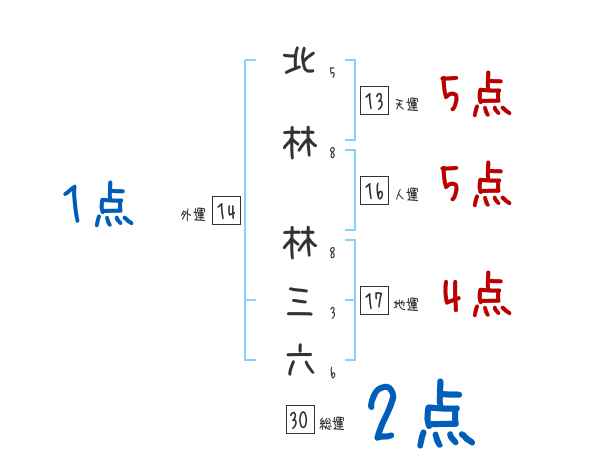 天運![]() | 北林林三六さんの天運は13画の5つ星!才能に恵まれ人気がある。名声を手に入れる。円満な人生。 家系が持つ宿命的な運勢を表します。祖先から受け継いだ苗字ですので自分の力が及びません。家柄を象徴します。 |