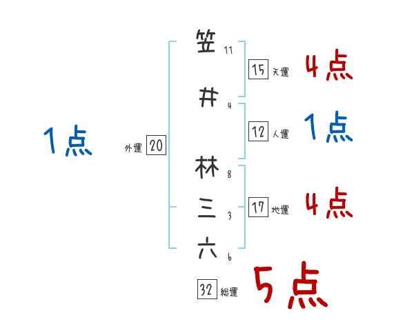 総運![]() | 笠井林三六さんの総運は32画の5つ星!柔軟性があり成功する。チャンスが多く金運が良い。 あなたの人生を表す1番重要な運勢です。生涯を通じて影響する総合運となり、主に50歳以降の晩年期に影響を及ぼします。 |