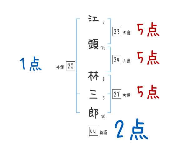 天運![]() | 江頭林三郎さんの天運は23画の5つ星!想像力に優れ活力がある。一代で成功し名誉を手に入れる。 家系が持つ宿命的な運勢を表します。祖先から受け継いだ苗字ですので自分の力が及びません。家柄を象徴します。 |