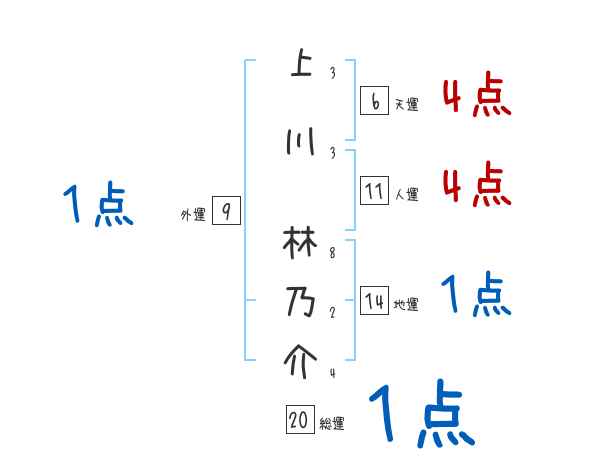 天運![]() | 上川林乃介さんの天運は6画の4つ星!慎重な努力家で信頼を得る。誠実な精神で向上心に優れる。 家系が持つ宿命的な運勢を表します。祖先から受け継いだ苗字ですので自分の力が及びません。家柄を象徴します。 |