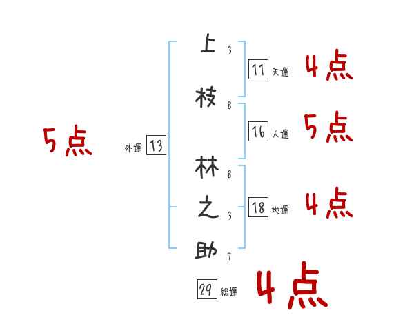人運![]() | 上枝林之助さんの人運は16画の5つ星!人望が厚く大きく発展する。逆転成功が見える。 性格や才能などを表す2番目に重要な運勢です。人間関係や協調性、社会的な成功に影響します。主に20歳から50歳ぐらいまでの中年期の運勢を表します。 |