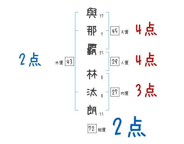 総運![]() | 與那覇林汰朗さんの総運は72画の2つ星!災難が多く不安定な生活にならないように注意。明暗のある人生かも。 あなたの人生を表す1番重要な運勢です。生涯を通じて影響する総合運となり、主に50歳以降の晩年期に影響を及ぼします。 |