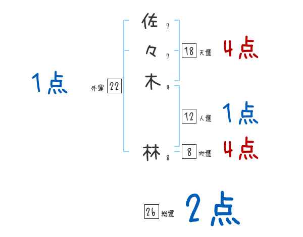 天運![]() | 佐々木林さんの天運は18画の4つ星!情熱的で剛気。忍耐力があり信頼される。 家系が持つ宿命的な運勢を表します。祖先から受け継いだ苗字ですので自分の力が及びません。家柄を象徴します。 |