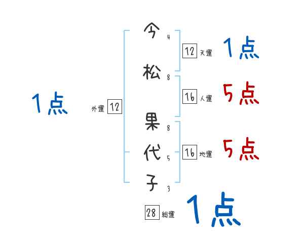 人運![]() | 今松果代子さんの人運は16画の5つ星!人望が厚く大きく発展する。逆転成功が見える。 性格や才能などを表す2番目に重要な運勢です。人間関係や協調性、社会的な成功に影響します。主に20歳から50歳ぐらいまでの中年期の運勢を表します。 |