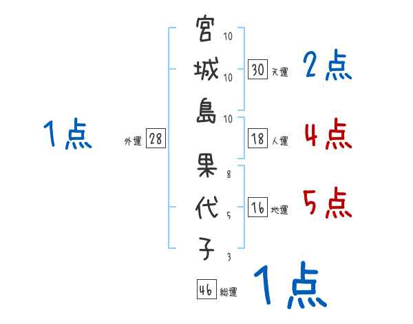 総運![]() | 宮城島果代子さんの総運は46画の1つ星!迷走することが多く苦労するかも。目先のことにとらわれないように。 あなたの人生を表す1番重要な運勢です。生涯を通じて影響する総合運となり、主に50歳以降の晩年期に影響を及ぼします。 |