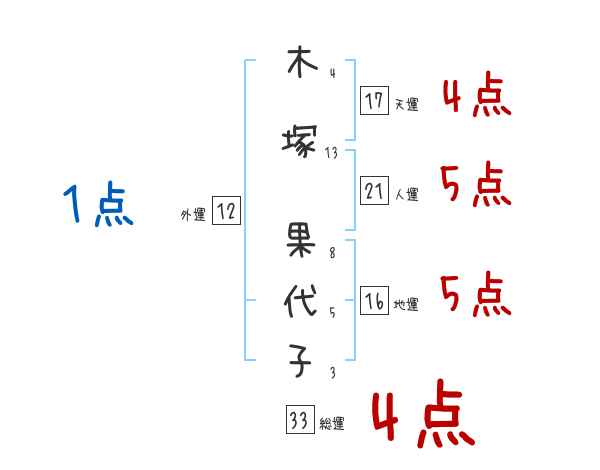 天運![]() | 木塚果代子さんの天運は17画の4つ星!積極的な行動力。地位を気づき財産を手に入れる。純粋な心と直感力。 家系が持つ宿命的な運勢を表します。祖先から受け継いだ苗字ですので自分の力が及びません。家柄を象徴します。 |