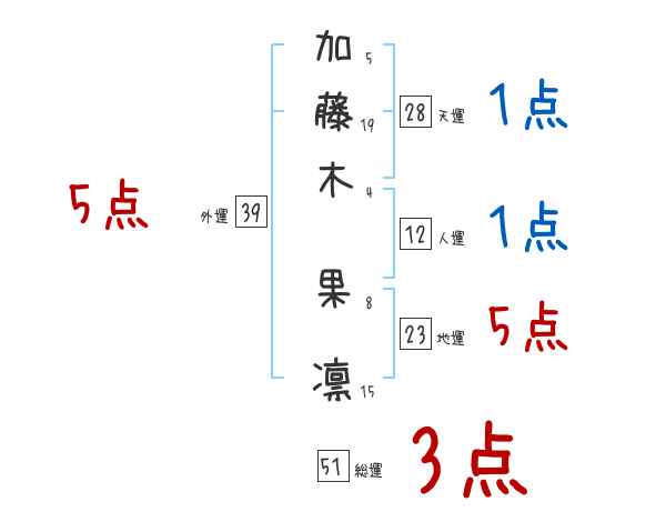外運![]() | 加藤木果凛さんの外運は39画の5つ星!社交性に優れ人望が厚い。人の上に立ち成功する。 生活面を象徴する運勢です。外部から受ける影響力を表し、結婚運、家庭運や職場、環境への順応性を表します。 |