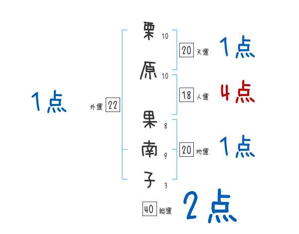 外運![]() | 栗原果南子さんの外運は22画の1つ星!努力することが苦手ないっぽう手先が器用。芸術性にも優れる。 生活面を象徴する運勢です。外部から受ける影響力を表し、結婚運、家庭運や職場、環境への順応性を表します。 |