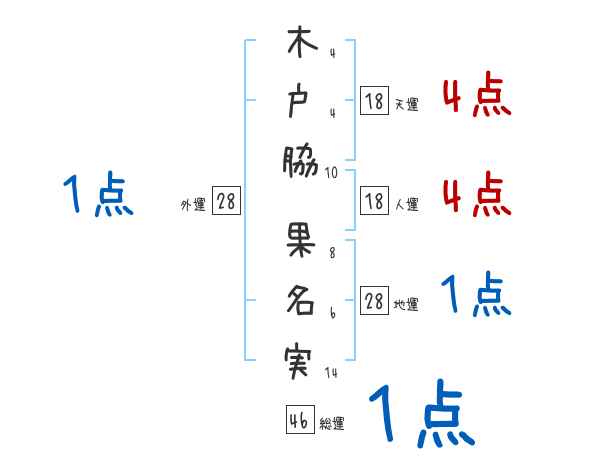 天運![]() | 木戸脇果名実さんの天運は18画の4つ星!情熱的で剛気。忍耐力があり信頼される。 家系が持つ宿命的な運勢を表します。祖先から受け継いだ苗字ですので自分の力が及びません。家柄を象徴します。 |