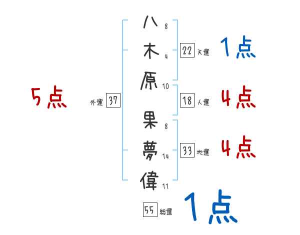 人運![]() | 八木原果夢偉さんの人運は18画の4つ星!情熱的で剛気。忍耐力があり信頼される。 性格や才能などを表す2番目に重要な運勢です。人間関係や協調性、社会的な成功に影響します。主に20歳から50歳ぐらいまでの中年期の運勢を表します。 |