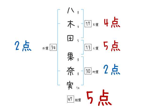 外運![]() | 八木田果奈実さんの外運は34画の2つ星!独創性に優れるが、自尊心が強く災難に注意しましょう。 生活面を象徴する運勢です。外部から受ける影響力を表し、結婚運、家庭運や職場、環境への順応性を表します。 |