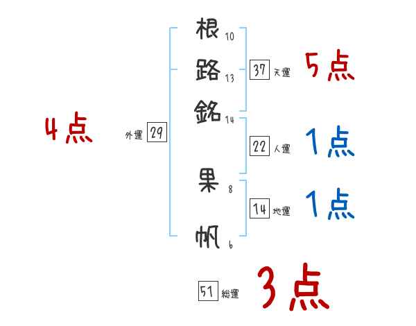 外運![]() | 根路銘果帆さんの外運は29画の4つ星!完全主義で才能がある。厳格な心の持ち主。 生活面を象徴する運勢です。外部から受ける影響力を表し、結婚運、家庭運や職場、環境への順応性を表します。 |