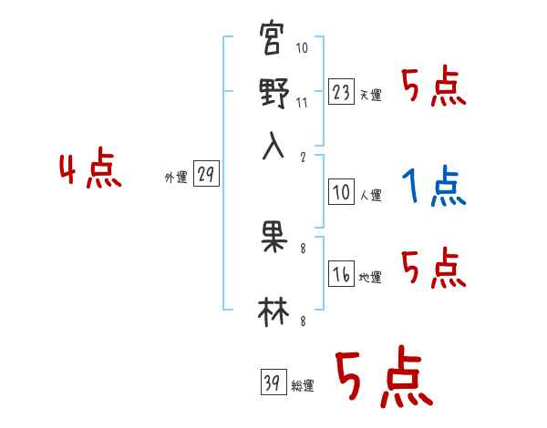 外運![]() | 宮野入果林さんの外運は29画の4つ星!完全主義で才能がある。厳格な心の持ち主。 生活面を象徴する運勢です。外部から受ける影響力を表し、結婚運、家庭運や職場、環境への順応性を表します。 |