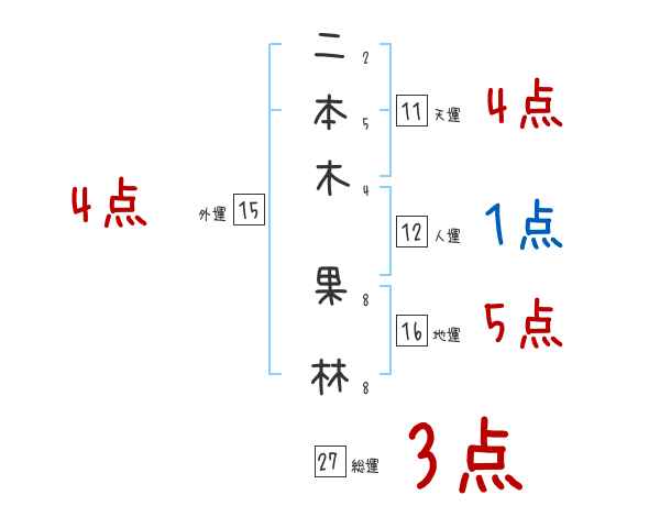 天運![]() | 二本木果林さんの天運は11画の4つ星!着実に富や地位を得る幸運な人生。 家系が持つ宿命的な運勢を表します。祖先から受け継いだ苗字ですので自分の力が及びません。家柄を象徴します。 |