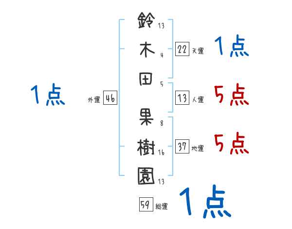 人運![]() | 鈴木田果樹園さんの人運は13画の5つ星!才能に恵まれ人気がある。名声を手に入れる。円満な人生。 性格や才能などを表す2番目に重要な運勢です。人間関係や協調性、社会的な成功に影響します。主に20歳から50歳ぐらいまでの中年期の運勢を表します。 |