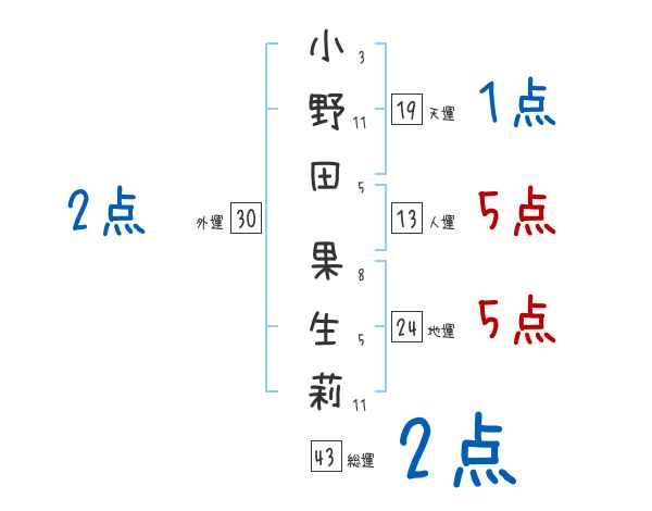 総運![]() | 小野田果生莉さんの総運は43画の2つ星!頑固な性格で独立心が強いかも。やや非現実的で浪費に注意しましょう。 あなたの人生を表す1番重要な運勢です。生涯を通じて影響する総合運となり、主に50歳以降の晩年期に影響を及ぼします。 |